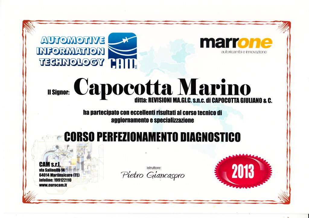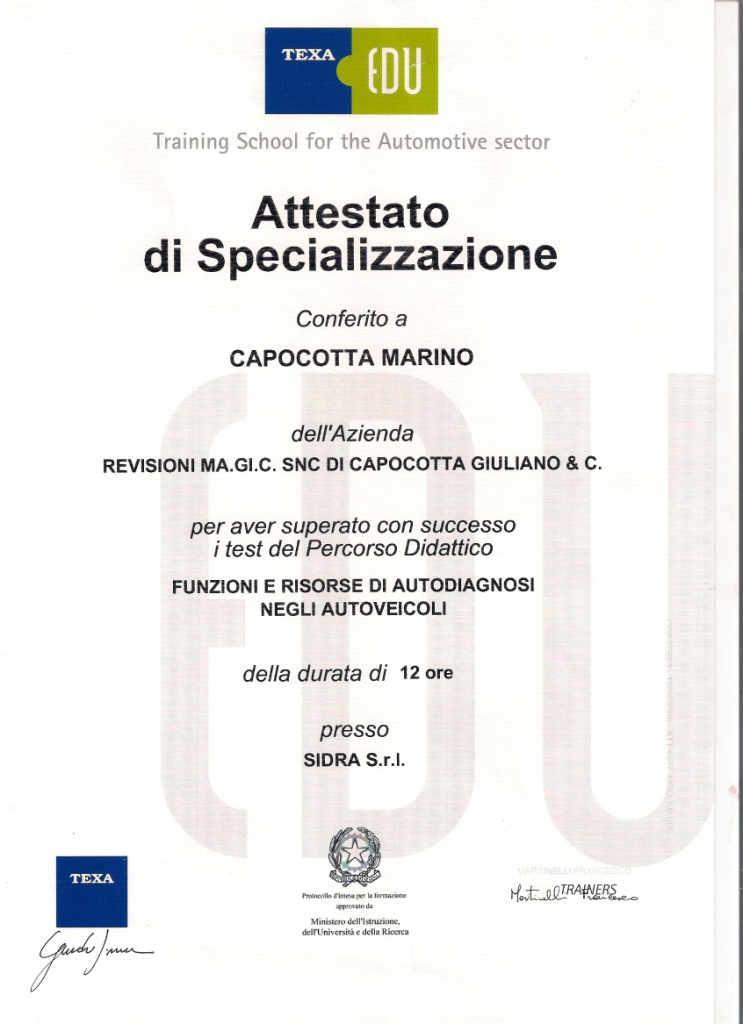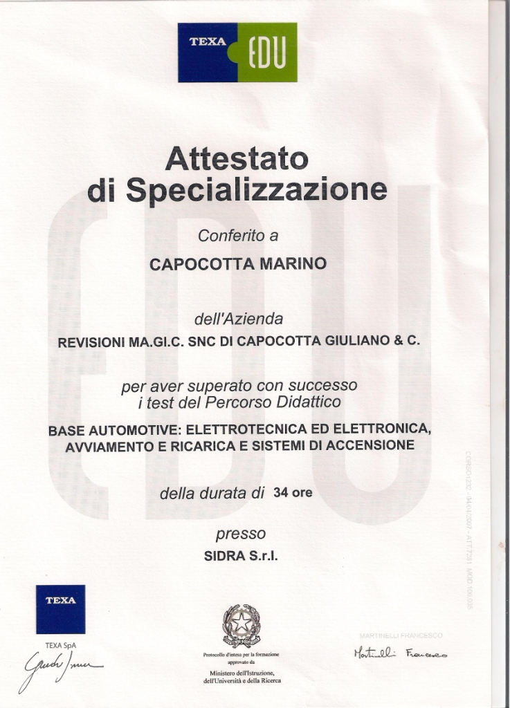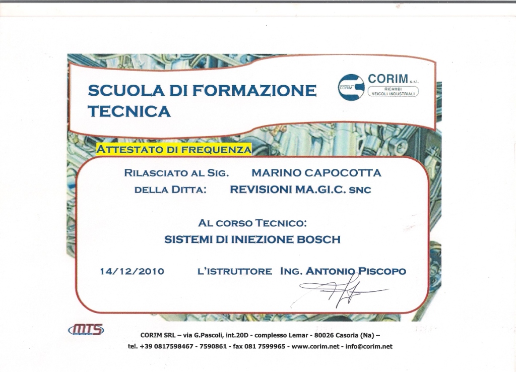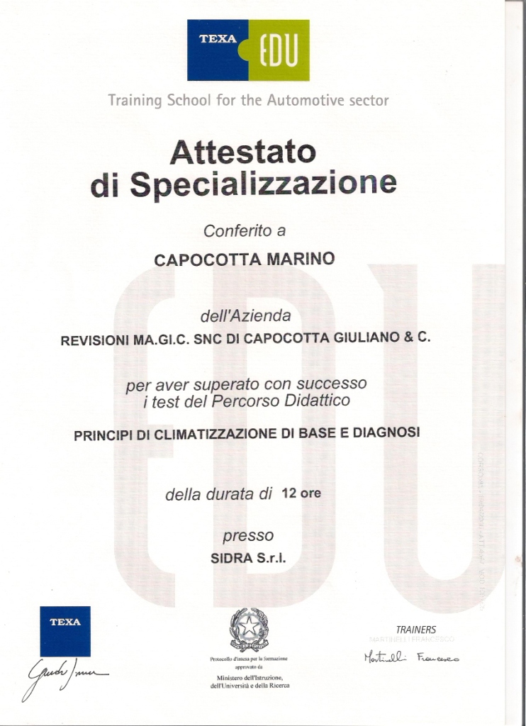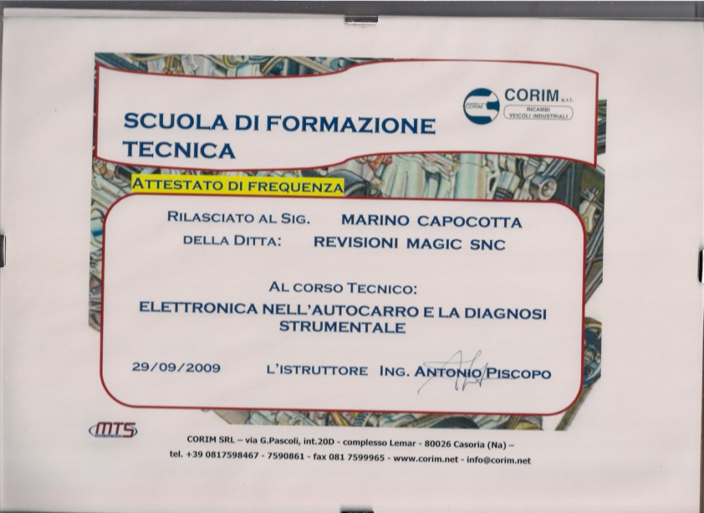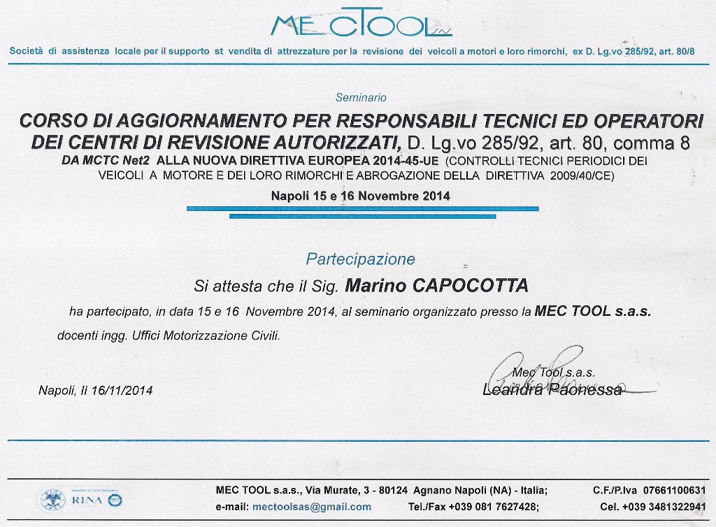 | 2014 | Corso di aggiornamento Responsabile Tecnico dei Centri Revisione |