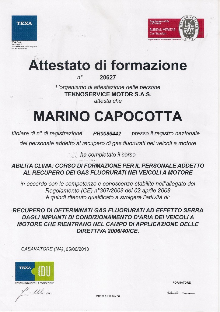 | 2014 | CORSO FORMAZIONE PERSONALE ADDETTO AL RECUPERO GAS FLUORATI NEI VEICOLI A MOTORE |